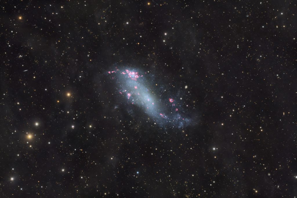 Les grandes galaxies spirales semblent souvent rafler toute la gloire, exhibant leurs jeunes amas d’étoiles bleues et brillantes dans de magnifiques bras spiraux symétriques. Mais les petites galaxies irrégulières forment elles aussi des étoiles. En effet, la galaxie naine IC 2574 montre des signes évidents d’une intense activité de formation stellaire dans ses régions rougeâtres révélatrices d’hydrogène gazeux incandescent. Tout comme dans les galaxies spirales, les régions turbulentes de formation stellaire dans IC 2574 sont agitées par des vents stellaires et des explosions de supernovas qui projettent de la matière dans le milieu interstellaire de la galaxie et déclenchent la formation d’autres étoiles. Située à seulement 12 millions d’années-lumière, IC 2574 fait partie du groupe de galaxies M81, visible dans la constellation nordique de la Grande Ourse. Également connu sous le nom de nébuleuse de Coddington, cet univers insulaire faible mais intrigant mesure environ 50 000 années-lumière de diamètre et a été découvert par l’astronome américain Edwin Coddington en 1898.