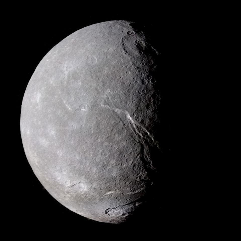 Le relief accidenté de Titania est un mélange de canyons, de falaises et de cratères. La sonde interplanétaire Voyager 2 de la NASA a survolé la plus grande lune d’Uranus en 1986 et a pris cette photo. Le fait que les tranchées de Titania ressemblent à celles d’une autre lune d’Uranus, Ariel, suggère que Titania a subi un événement violent en surface, peut-être lié au gel et à l’expansion de l’eau dans son passé lointain. Bien que Titania soit la plus grande lune d’Uranus, son rayon n’atteint qu’environ la moitié de celui de Triton – la plus grande lune de Neptune, la planète sœur d’Uranus, qui est elle-même légèrement plus petite que la Lune terrestre. Titania, découverte par William Herschel en 1787, est essentiellement une grosse boule de glace sale composée pour moitié de glace d’eau et pour moitié de roche. Des hypothèses récentes suggèrent que le réchauffement radioactif ferait fondre une partie de la glace souterraine pour former des océans.